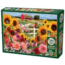 - Gården och hästarna kan precis anas genom ett överflöd av färgstrålande dahlior och solrosor