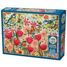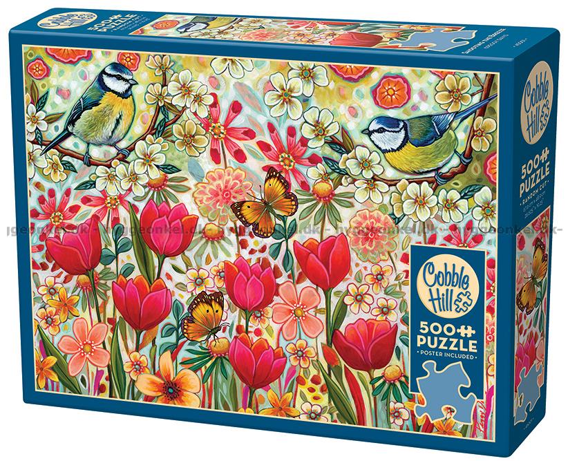 - De små blåmesar tittar på varandra och de fina tulpanerna