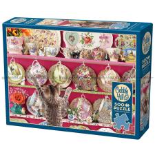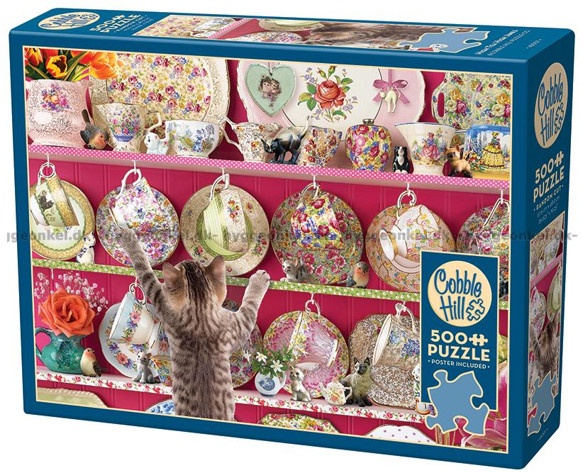 - Den här katten är mycket intresserad av hyllorna med de fina tekopparna