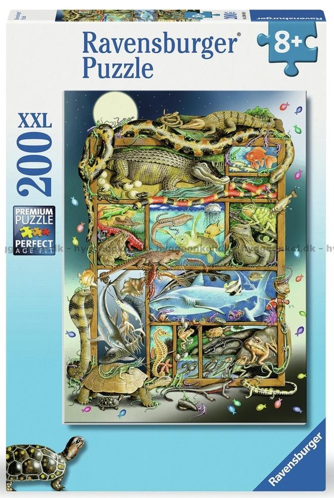 - Reptiler, havsdjur, groddjur och fiskar kryper, krälar och simmar runt i och på denna hylla