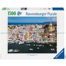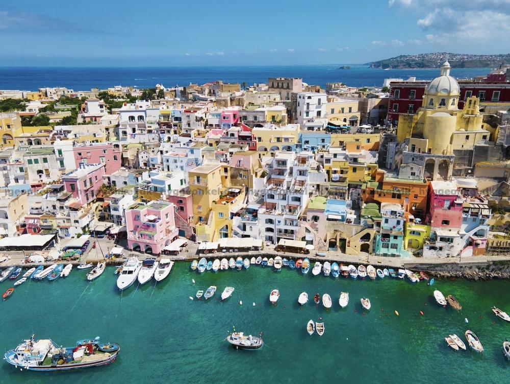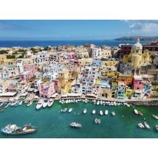 - Motivet visar en färgstark kuststad med en rad pastellfärgade byggnader längs vattnet. Staden är full av liv och charm, och de många färgerna skapar en festlig atmosfär.