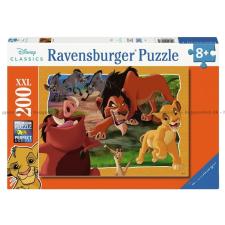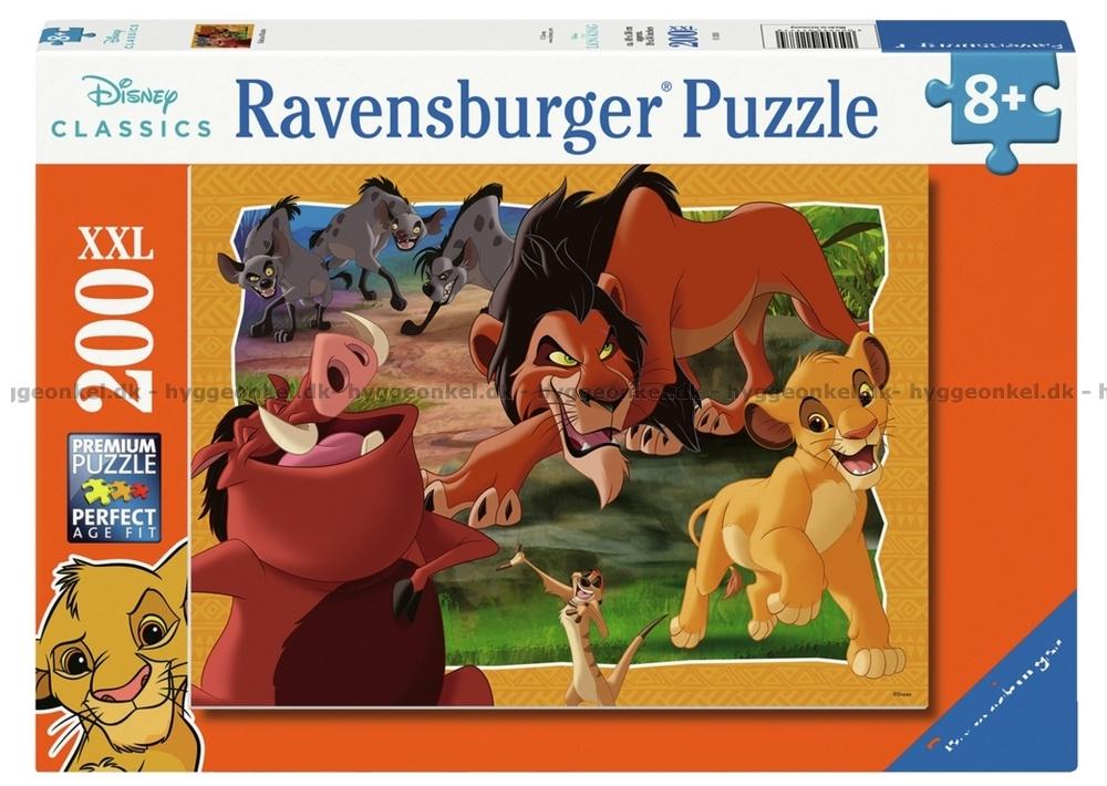 - Simba myser med sina vänner Timon och Pumbaa – men i bakgrunden lurar fienden Scar och de tre hyenorna Shenzi, Banzai och Ed