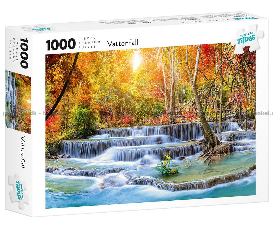 - Det vackra breda vattenfallet rinner fint genom skogen