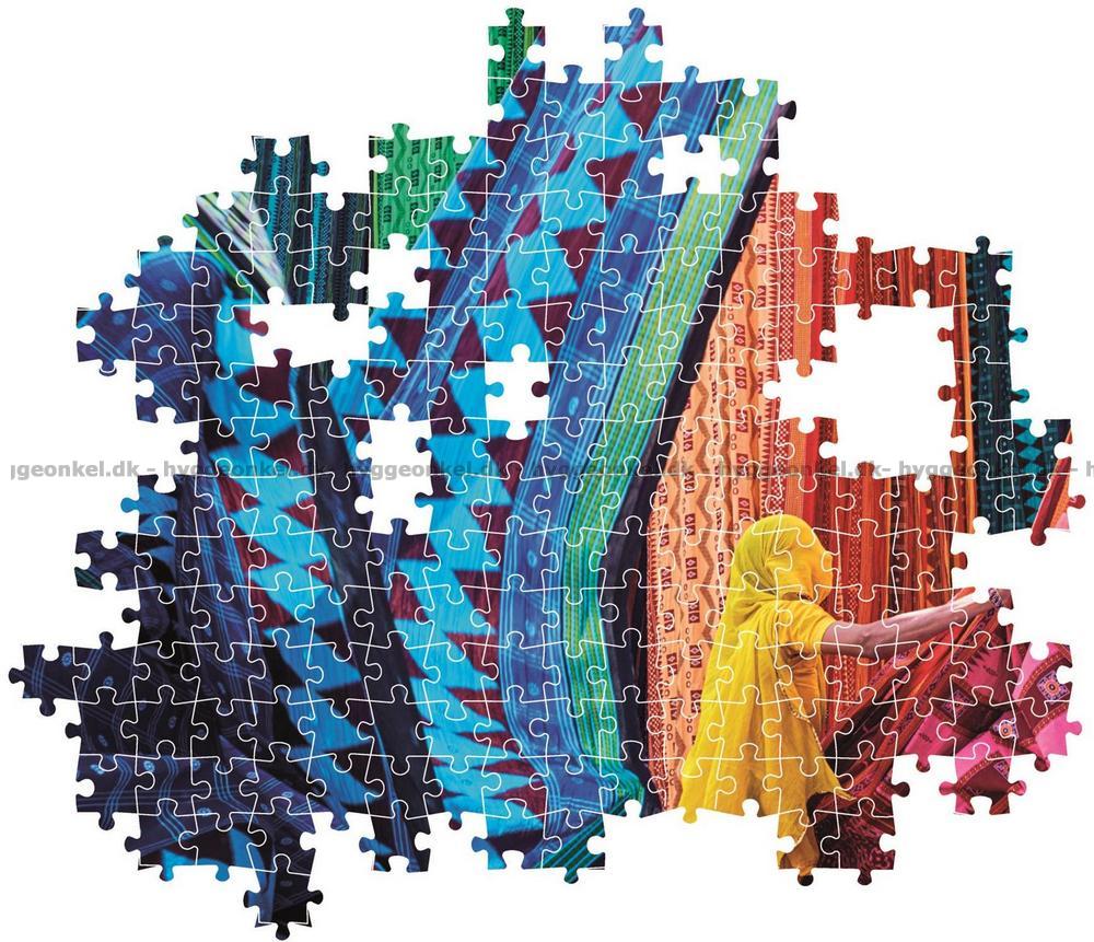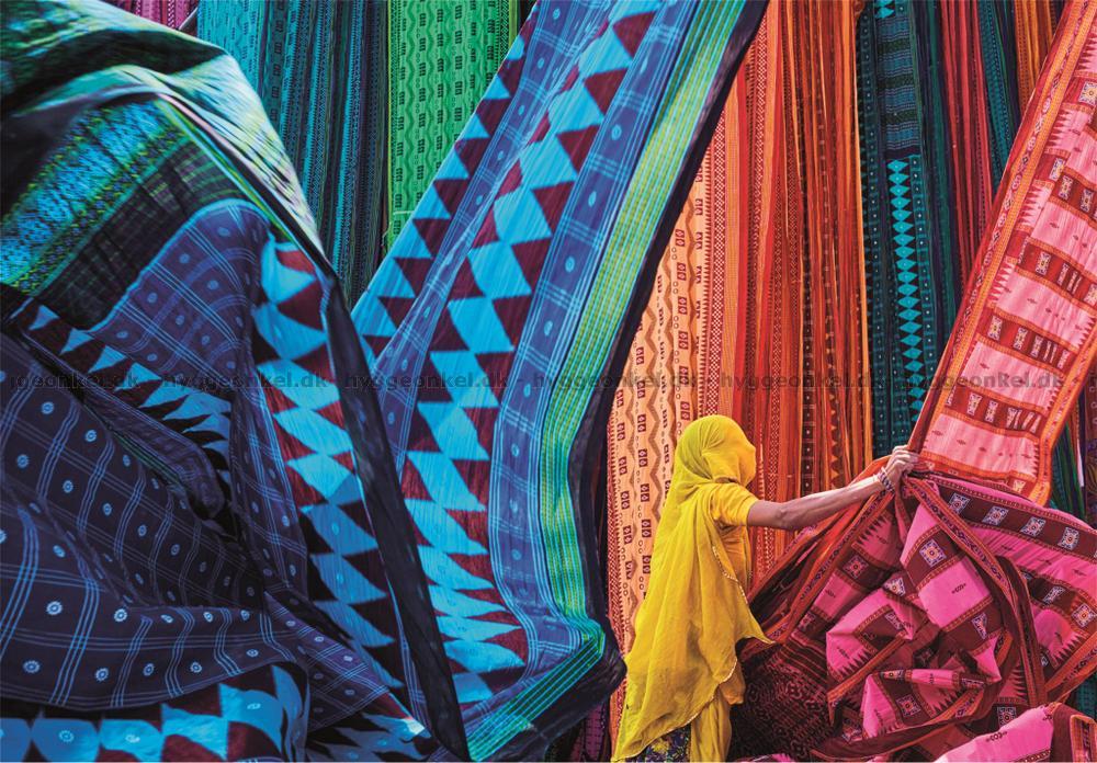 - Tygerna finns i ett brett spektrum av färger, inklusive blå, röd, rosa och orange. Varje tygstycke har unika geometriska mönster