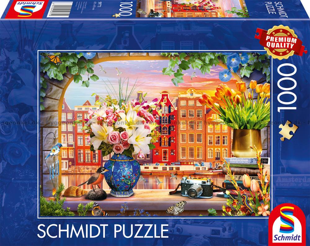 - Utsikten över Amsterdams kanaler och mysiga hus kan avnjutas genom den vackra stenbågen, där buketterna står och pryder