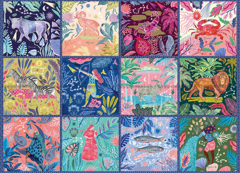 - Färgstark och fantasifull tolkning av zodiaken, där varje stjärntecken är illustrerat i en unik, tropisk miljö