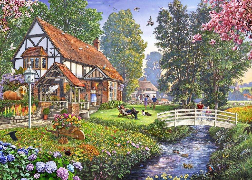 - Ett idylliskt landskap med ett korsvirkeshus omgivet av frodiga blommor och gröna träd. En liten bäck slingrar sig genom bilden, där änder simmar lugnt.