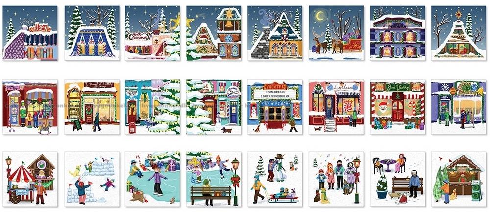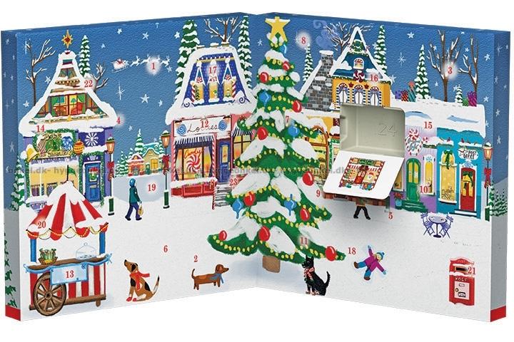 - Öppna en ny lucka varje dag – 24 luckor totalt. Denna kalender har mysiga julmotiv från den lilla staden