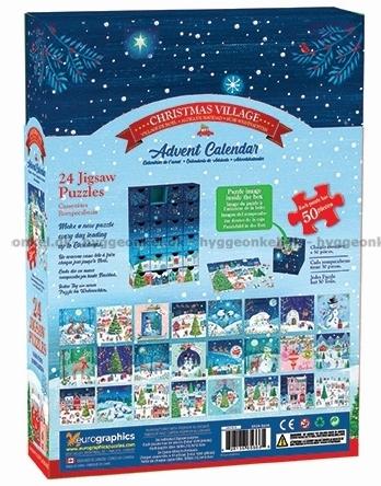 - Öppna en ny lucka varje dag – 24 luckor totalt. Varje motiv består av 50 bitar – totalt 1200 bitar. Motiven är ritade av Joanne Cave. Det handlar om 24 små pussel – de kan inte sättas ihop till ett stort.