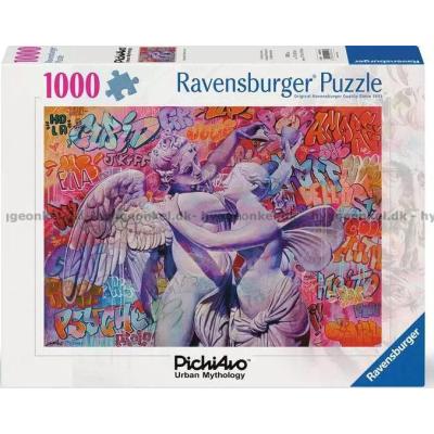 - De två mytologiska figurerna är omgivna av modern graffiti