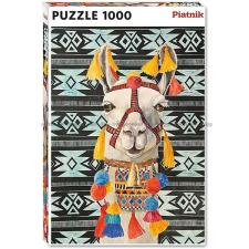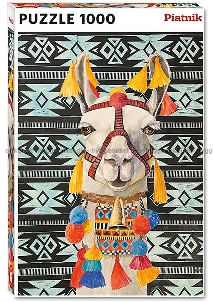 - En härlig lama med färgglad huvudbonad med röda och gula tofsar står framför en matta fylld med geometriska mönster