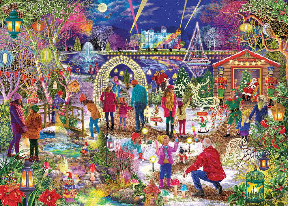 - En livlig julfest i parker. Människor i färgglada vinterjackor njuter av den festliga stämningen. En bro leder över en liten bäck där vattnet glittrar i ljuset från lyktorna. Träden är dekorerade med ljus och färgglada dekorationer.