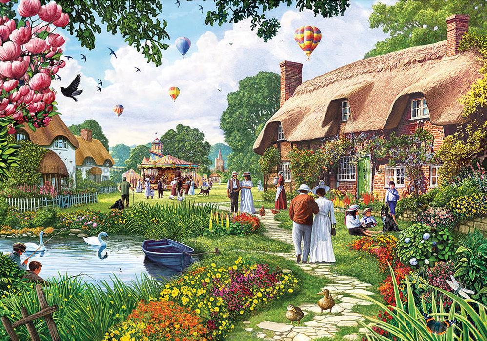 - Svanarna simmar runt i den lilla sjön i byn. Husen är täckta av klätterrosor