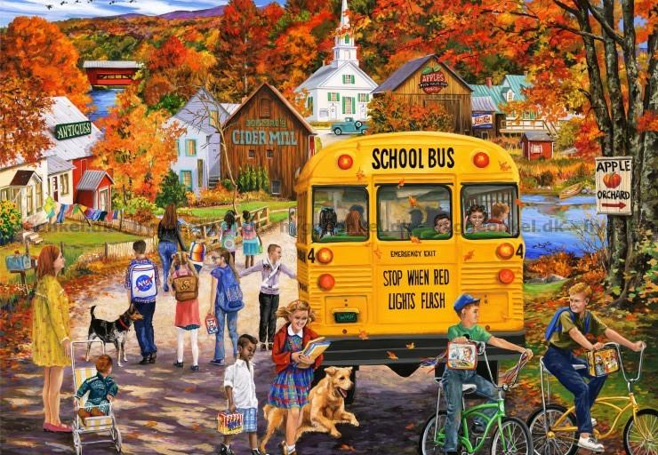 - Skolbussen transporterar barnen säkert till skolan. Höstens gyllene färger präglar landskapet