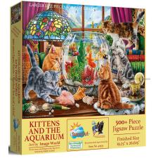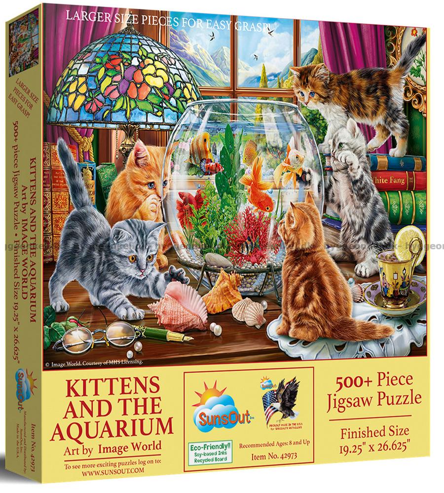 - En grupp nyfikna kattungar har samlats runt ett akvarium fyllt med färgglada fiskar. Kattungarna är fascinerade av de simmande varelserna och verkar planera sitt nästa drag
