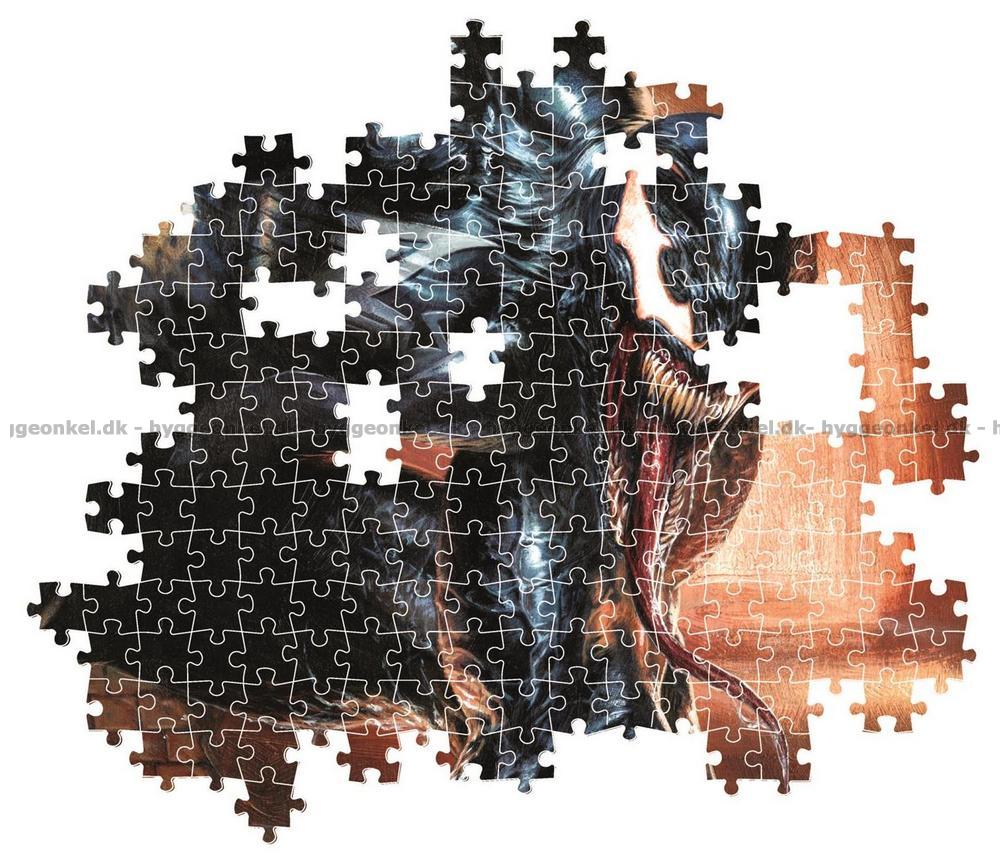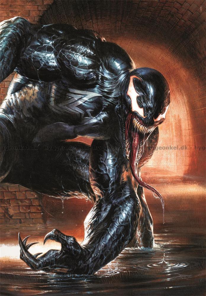 - Skurken Venom i en av stadens kloaker. Hans muskulösa kropp är framåtböjd och ansiktet är täckt av en mask med skarpa, vita ögon och en bred mun fylld med vassa tänder