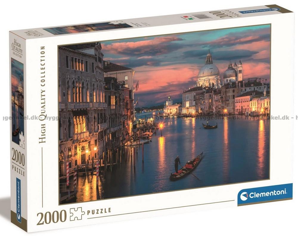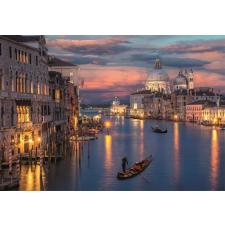 - En vacker kväll vid en stor kanal i Venedig, där ljuset från byggnaderna speglar sig i vattnet och skapar en magisk atmosfär