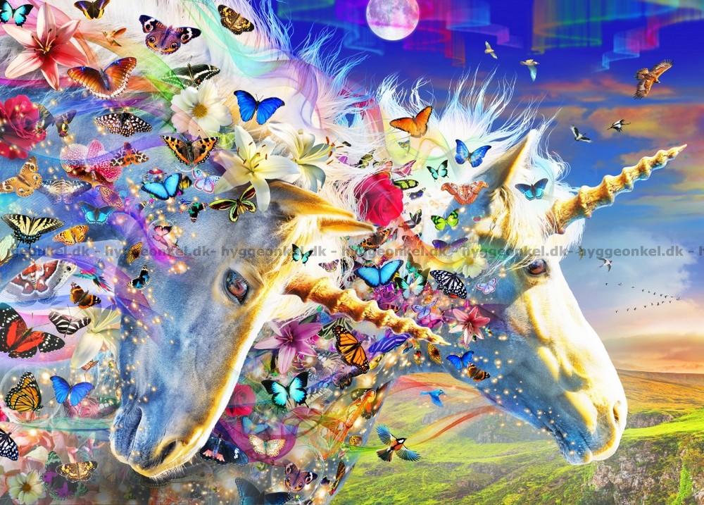 - En lång rad fjärilar svärmar runt de 2 enhörningarna
