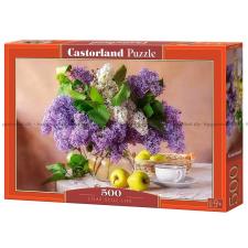 - Det är dukat för en kopp kaffe vid det lilla bordet. Bredvid koppen ligger ett par gröna äpplen