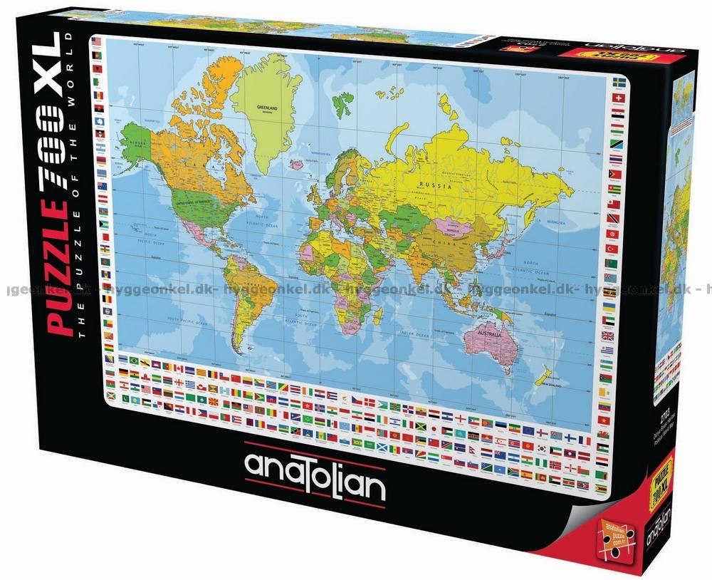 - En karta över världen med flaggor runt kanten. Texten är på engelska
