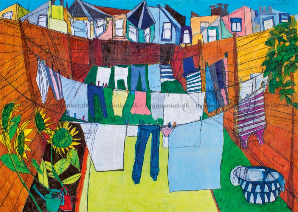 - Tvätten har hängts ut på tork i den färgglada bakgården. Längs staketet till vänster står stora solrosor som sträcker sig mot himlen