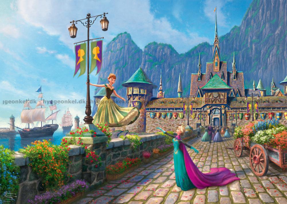 - Anna och Elsa på fest i Arendelle. Längs vägen finns blomsterbäddar fyllda med färgglada blommor som tillför en livlig och festlig stämning till motivet