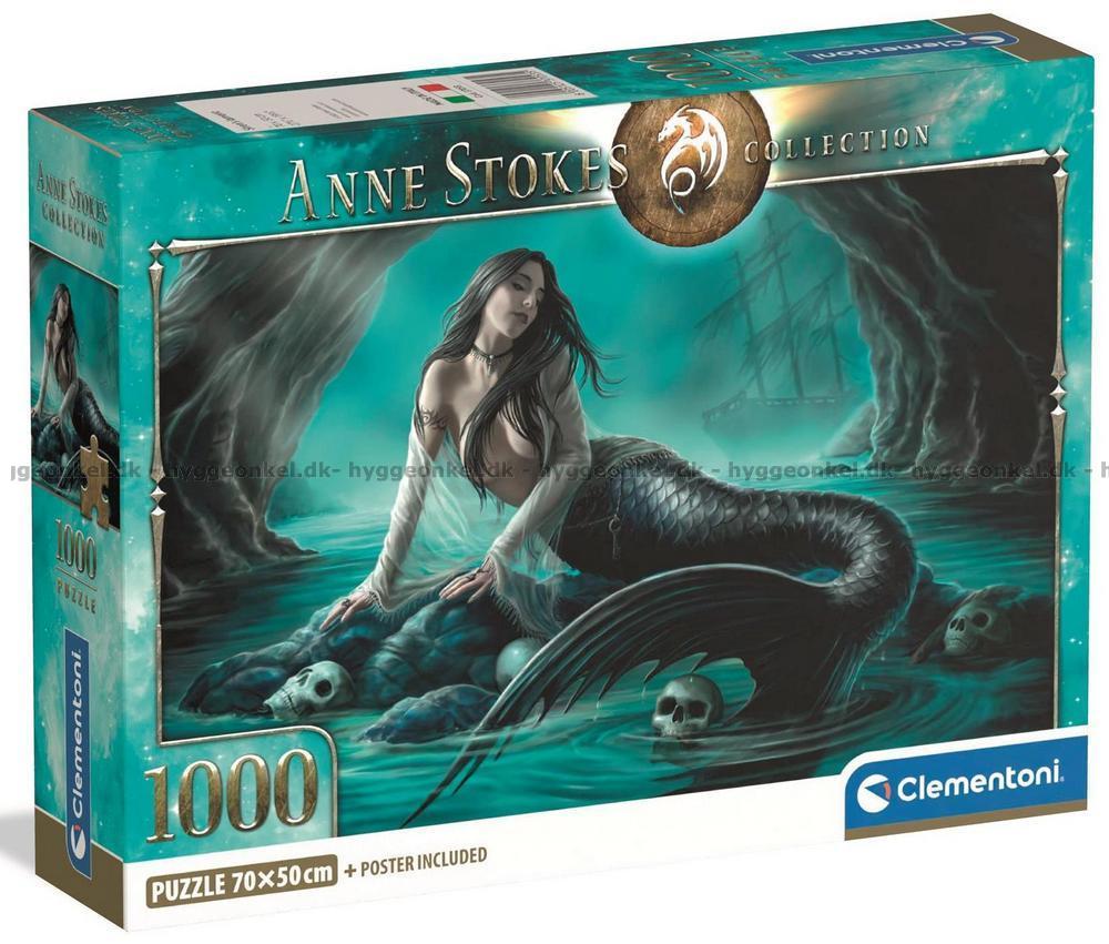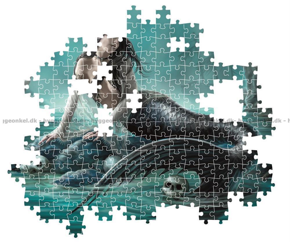 - Sjösirenen sitter på en klippa i en dunkel grotta. Hennes långa, mörka hår faller ner över axlarna medan hon drömmande blickar ut mot horisonten. Sjöjungfruns stjärt är fjällig och glänser i det svaga ljuset. Runt klippan ligger flera kranier som sticker upp ur det lugna vattnet.
