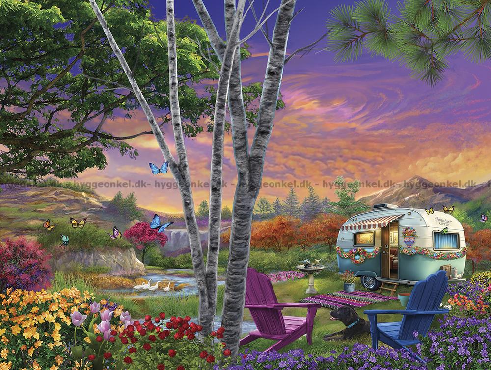 - Husvagnen är parkerad vackert ute i naturen, där solens sista strålar ger ett vackert sken över området