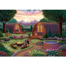 - Det är mysigt vid eldstaden framför stugorna medan solen går ner