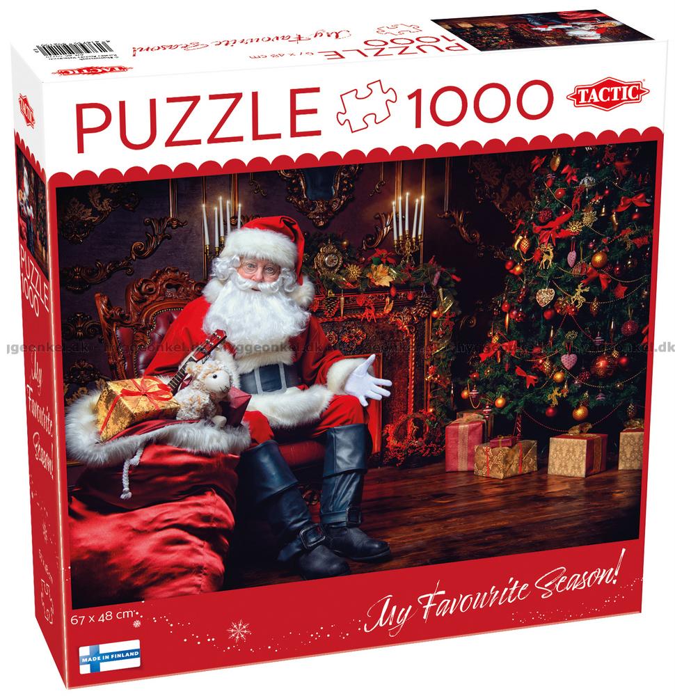 - Jultomten sitter i vardagsrummet framför den julpyntade granen