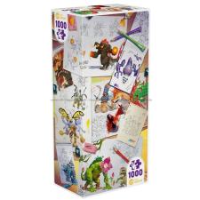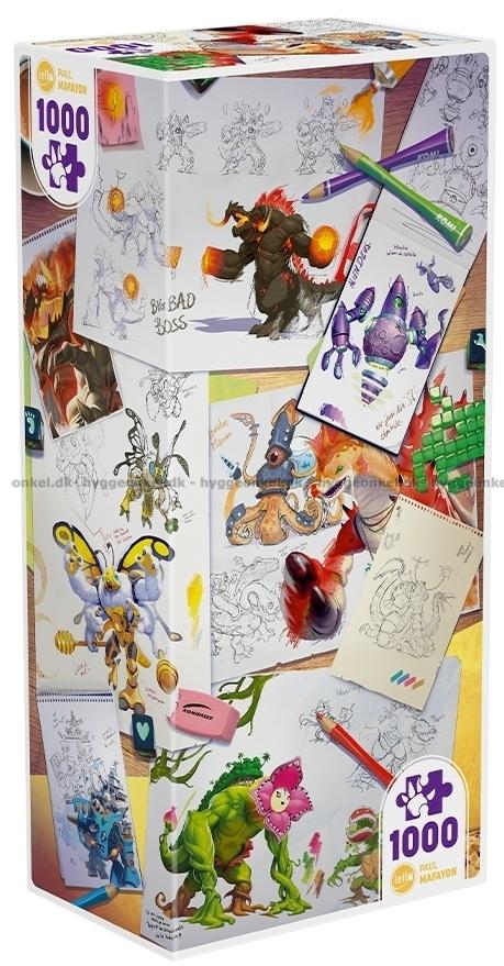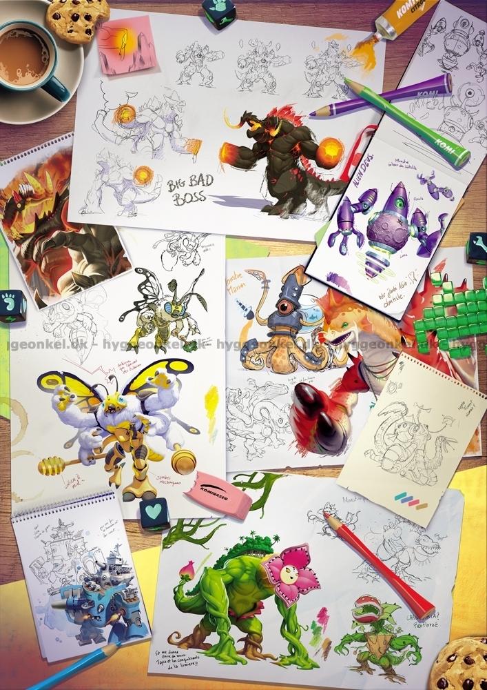 - Ett bord är täckt med olika teckningar av monster från brädspelet King of Tokyo. Det finns både färglagda och ofärdiga skisser som visar en kreativ process