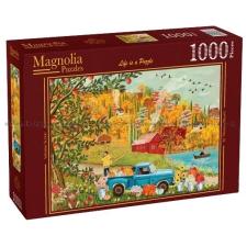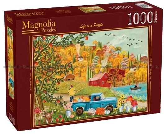 - Motivet visar en idyllisk höstscen med en färgstark blandning av natur och lantliv. Ett äppelträd fullt med röda äpplen sträcker sina grenar över bilden, medan en blå pickup står parkerad i förgrunden.