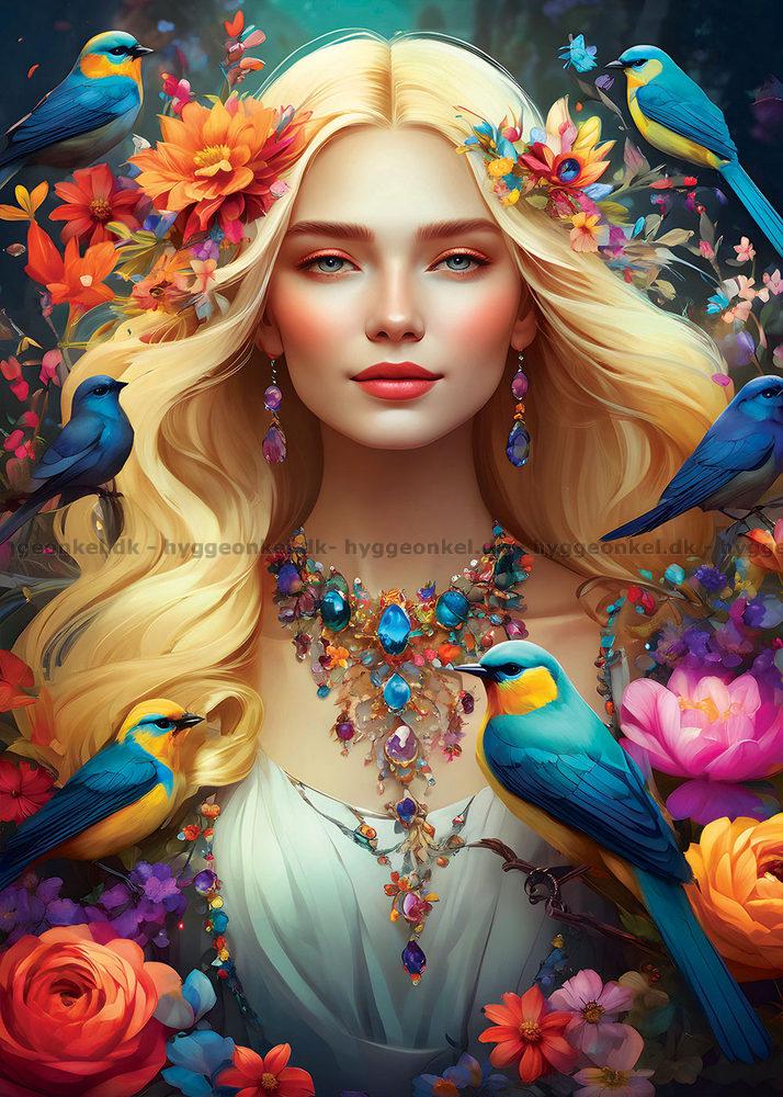 - Gudinnan omgiven av färgglada fåglar och blommor