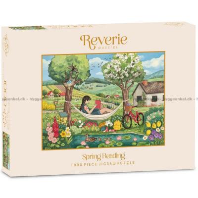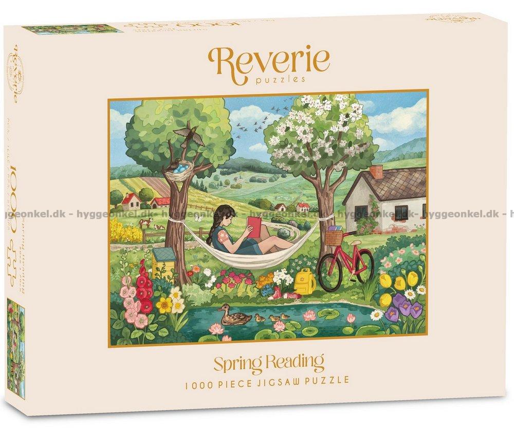 - Kvinnan ligger avslappnad i en hängmatta och läser en bok. Hon är omgiven av en frodig trädgård fylld med blommor och gröna träd