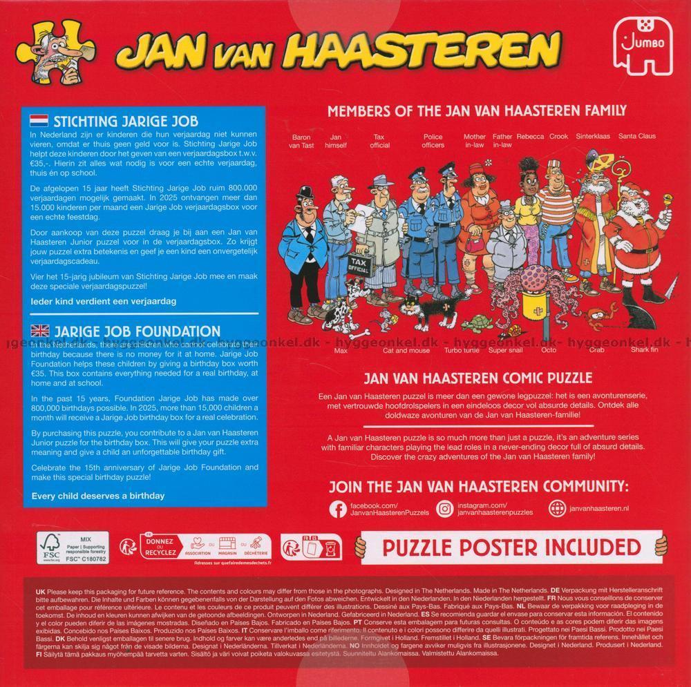 - Motivet är en del av Jan van Haasteren-serien, fylld med humoristiska detaljer. Pusslet finns också under namnet "Barnkalas, 1000 bitar". Det är samma motiv förutom överst, där det i vänstra hörnet finns en blå buss och i högra hörnet en banner med "Jarige Job", som är en holländsk stiftelse.