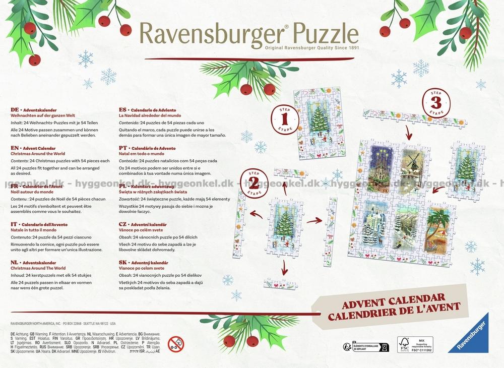 - Öppna en ny lucka varje dag – 24 luckor totalt. Varje motiv består av 54 bitar – totalt 1296 bitar. Pusslen kan läggas var för sig eller sättas ihop till ett stort motiv