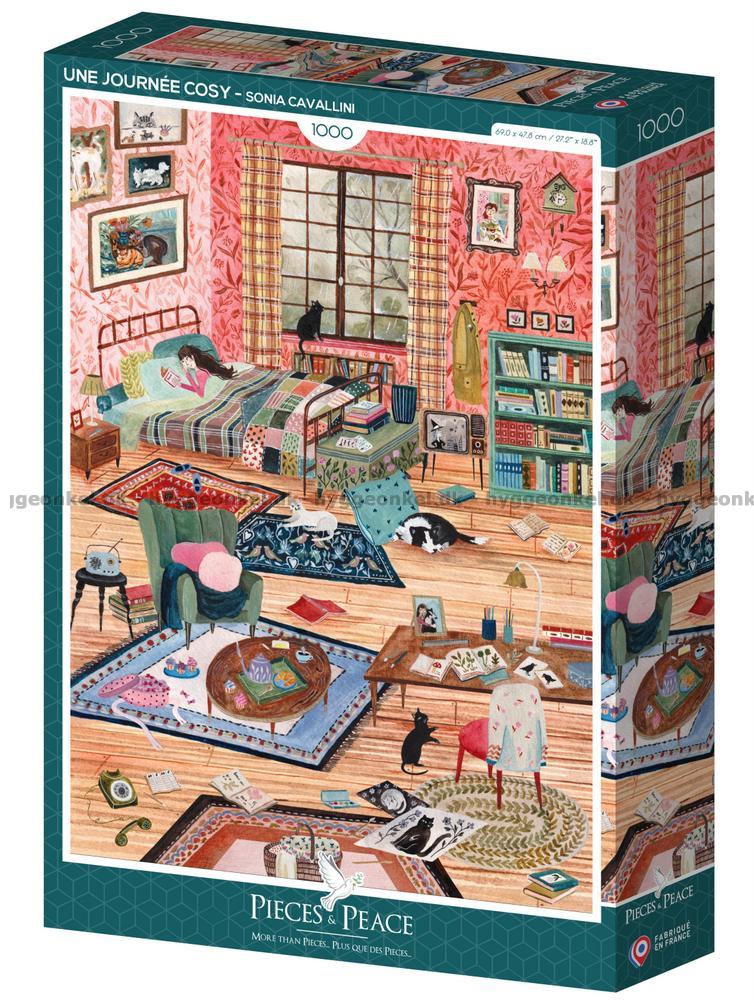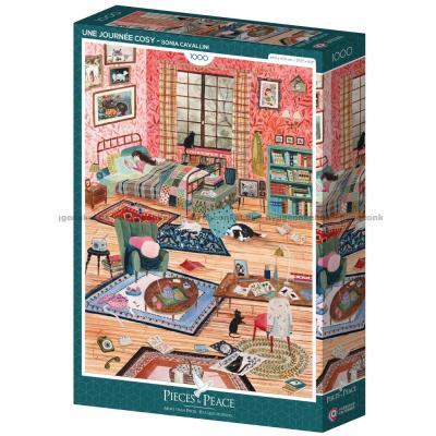- Ett mysigt rum fyllt med varma färger och hemtrevlig atmosfär. En person ligger avslappnat i sängen med en bok, medan katter slappnar av runtom i rummet