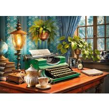 - På skrivbordet står en vacker, gammal grön skrivmaskin