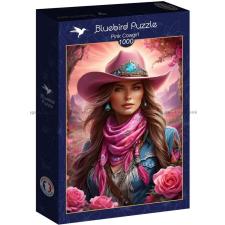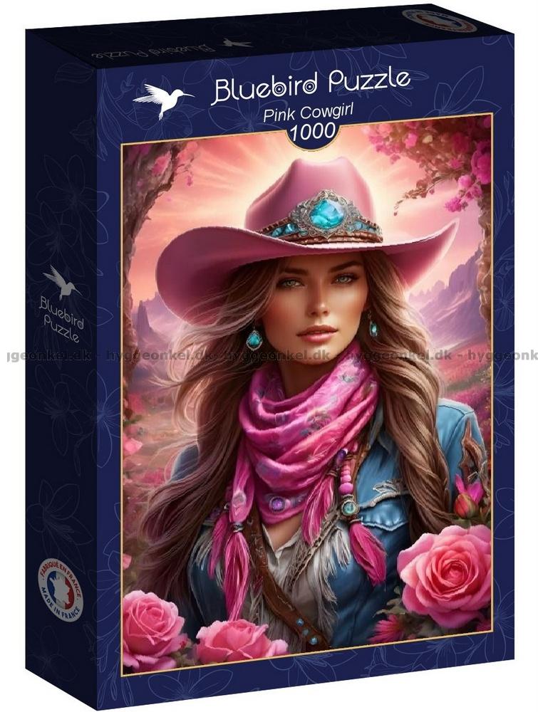 - Kvinnan klädd i westernkläder och med en stor rosa cowboyhatt