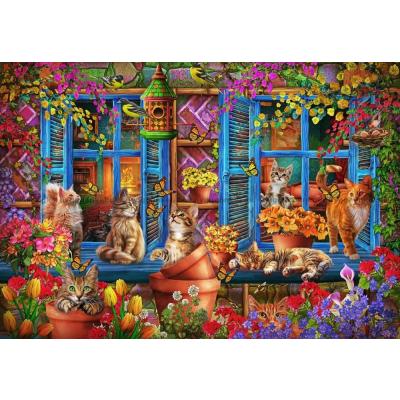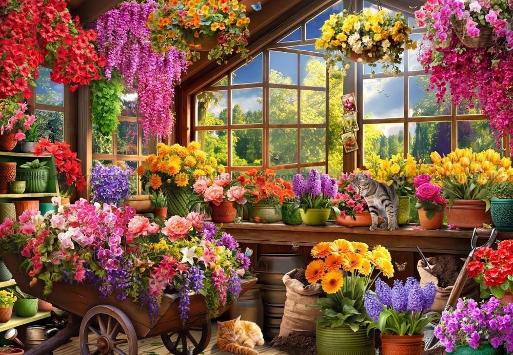 - Det frodiga växthuset är fyllt med färgglada blommor och växter. En katt sitter på bordet och njuter av omgivningarna, medan en annan katt ligger och slappnar av.