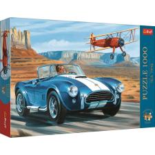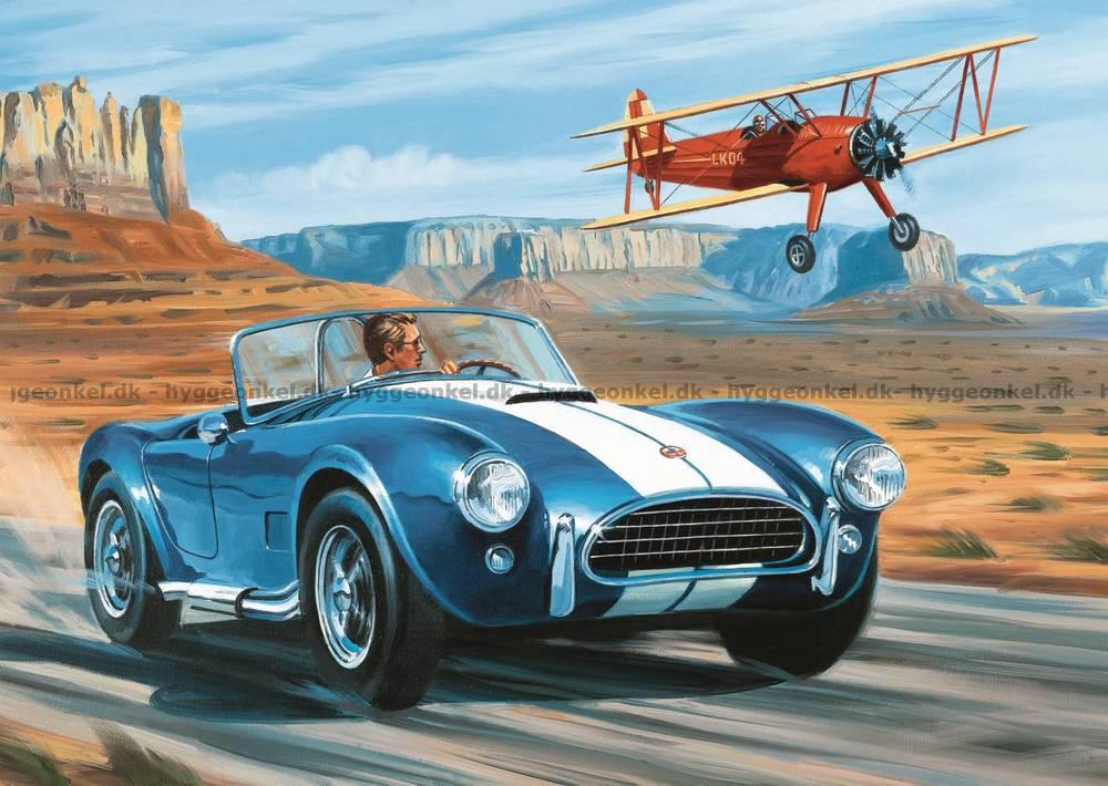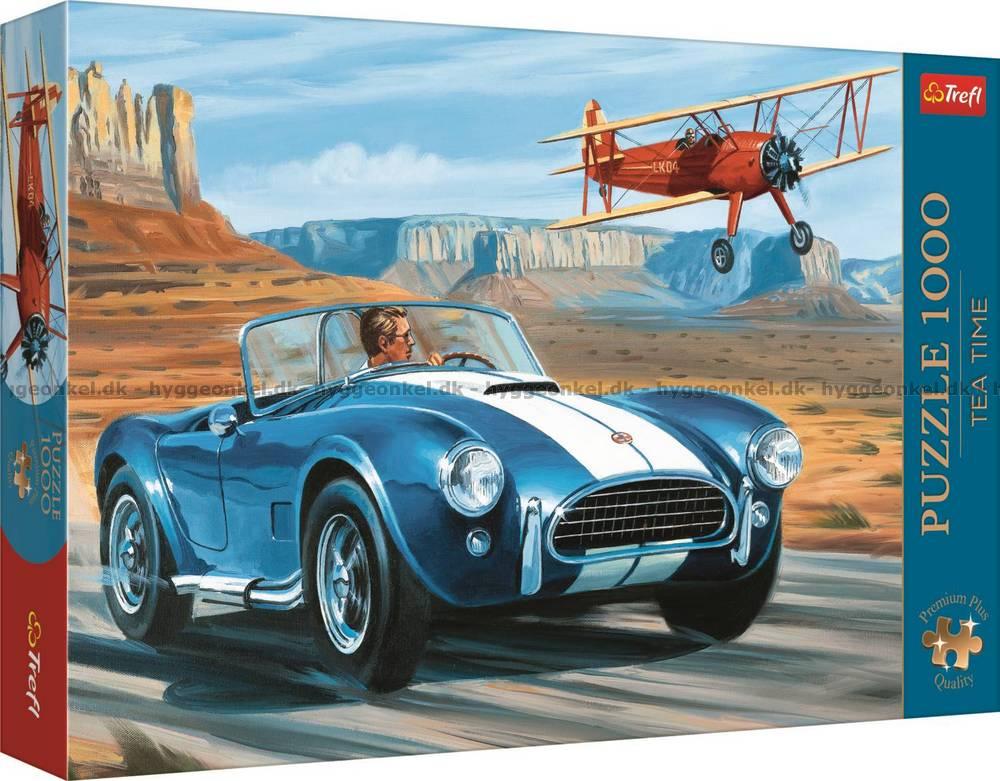 - Den blå sportbilen med vita ränder susar genom öknen
