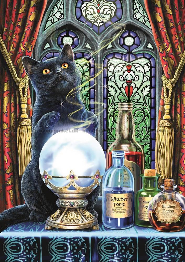 - En svart katt sitter framför ett färgstarkt, gotiskt fönster med en kristallkula framför sig. Den mystiska stämningen understryks av de många färgerna och detaljerna.