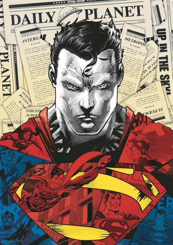 - Bakom honom tidningsurklipp från tidningen Daily Planet, där Clark Kent arbetar