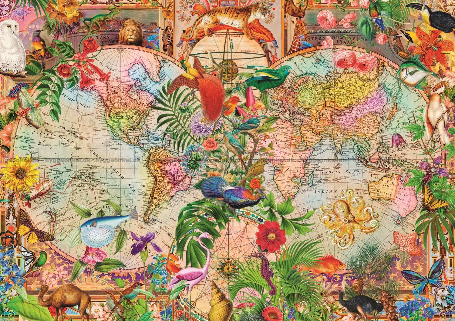 - Den antika världskartan är täckt med djur, blommor och växter
