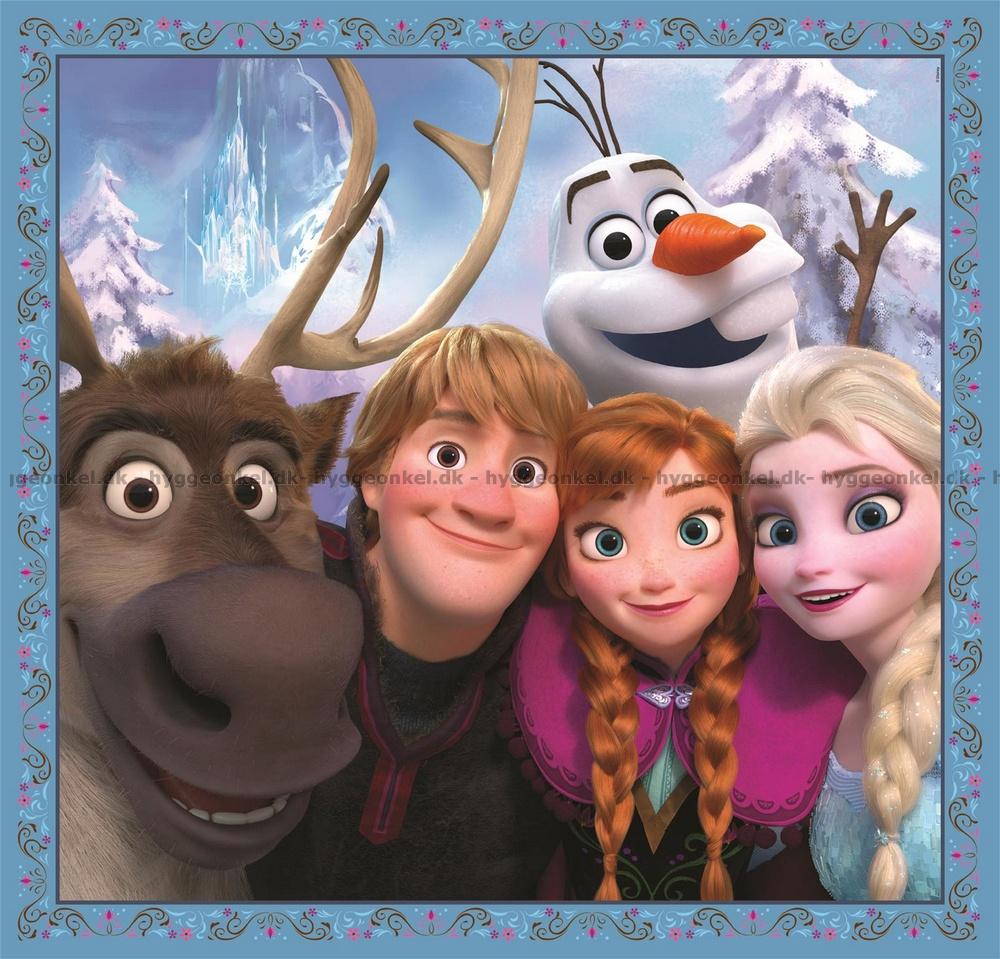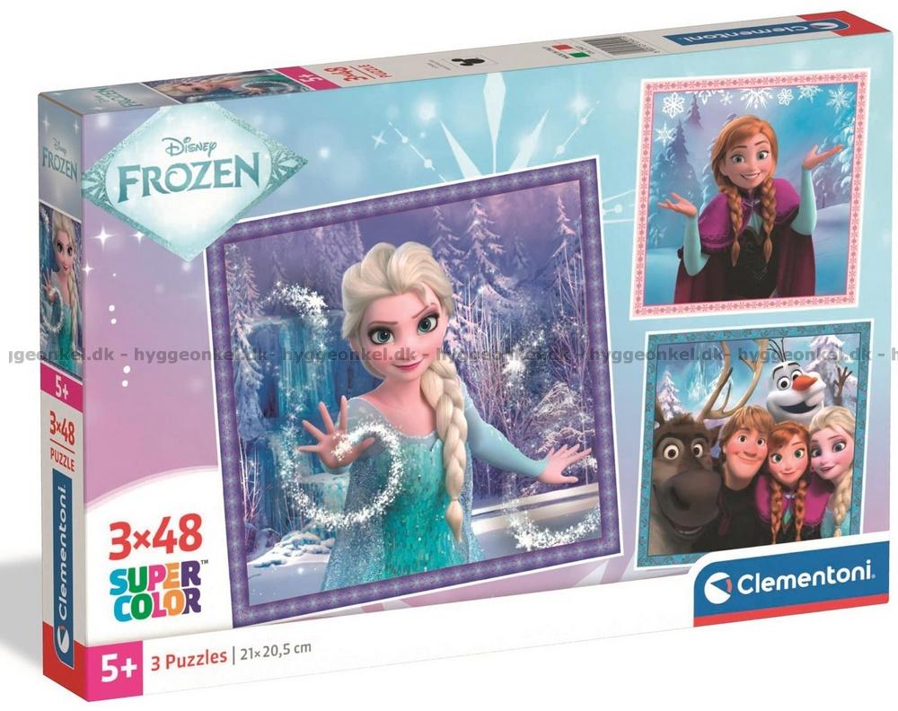 - 3 olika kvadratiska pussel med vardera 48 bitar samlade i en låda. Här är motiven med figurerna från Frost