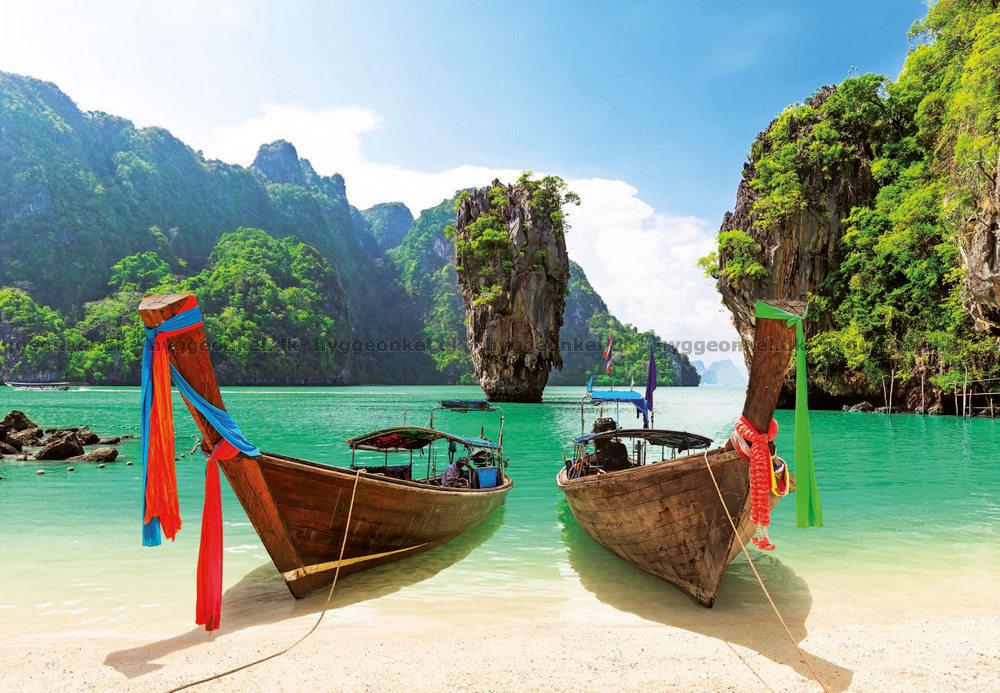 - De traditionella thailändska båtarna ligger förtöjda i det kristallklara, turkosgröna vattnet