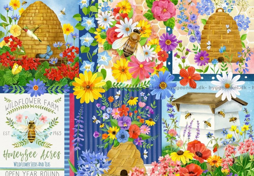 - Bikupor omgivna av blommor och bin som surrar runt. I mitten finns ett stort bi som sitter på en samling färgglada blommor