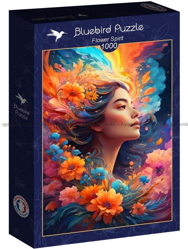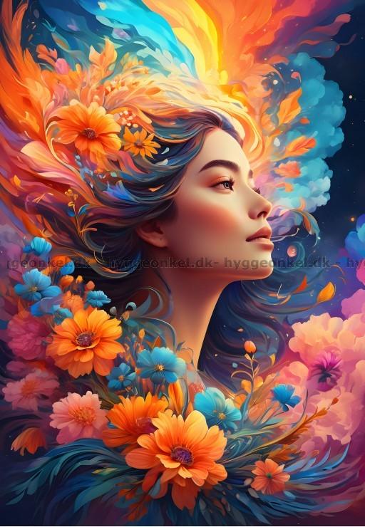 - Kvinnans ansikte är omgivet av färgsprakande blomsterprakt