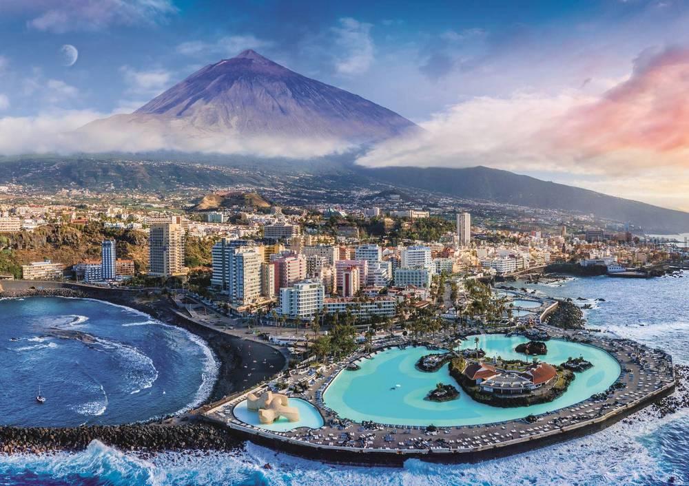 - Puerto de la Cruz på den norra kusten med vulkanen Teide i bakgrunden