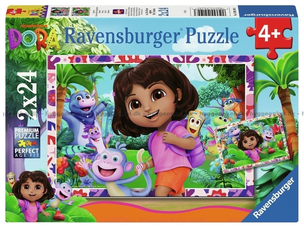 - I denna ask får du hela 2 Dora pussel. Båda motiven rekommenderas från 4 år